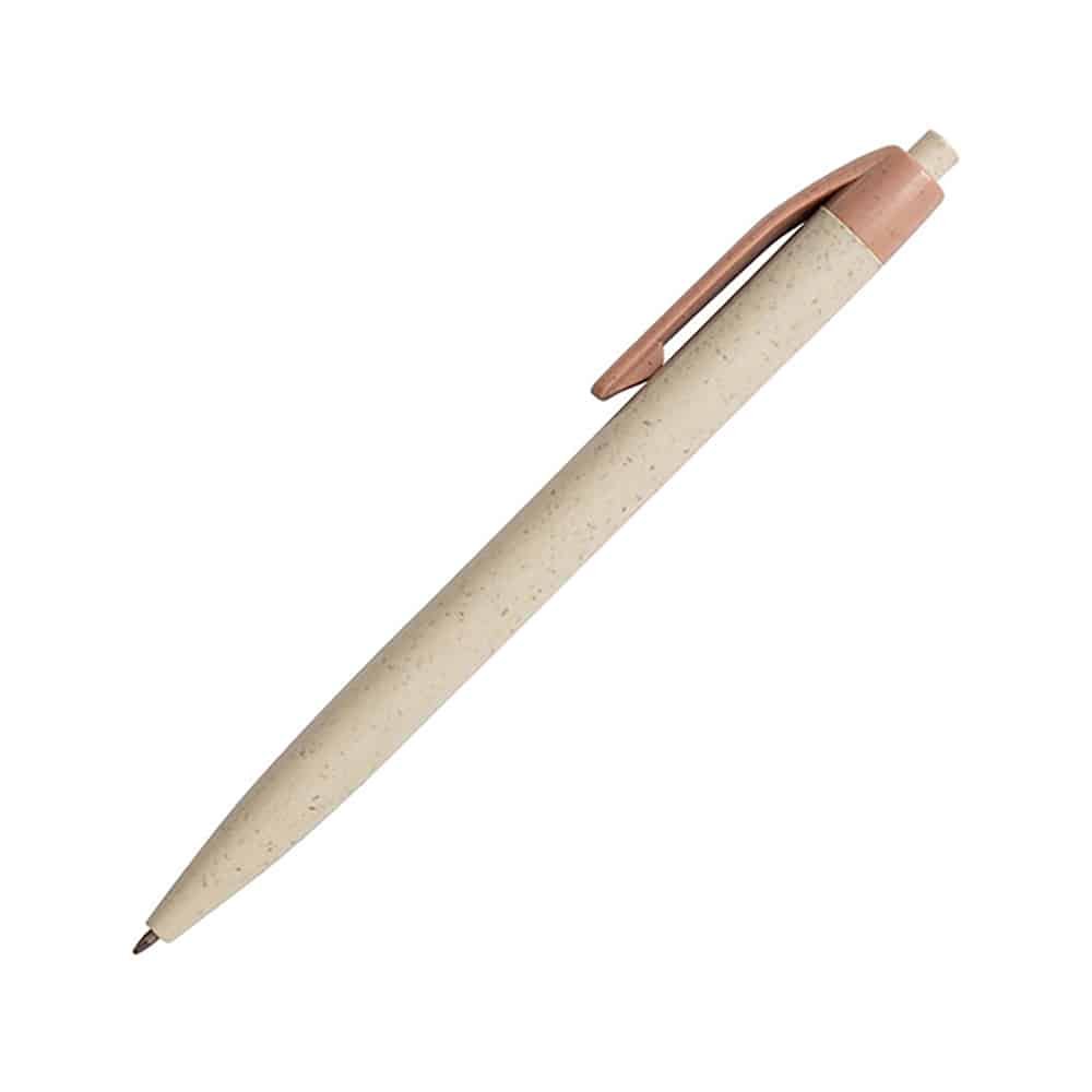 Bolígrafo retráctil, fabricado con plástico y compuesto de madera.