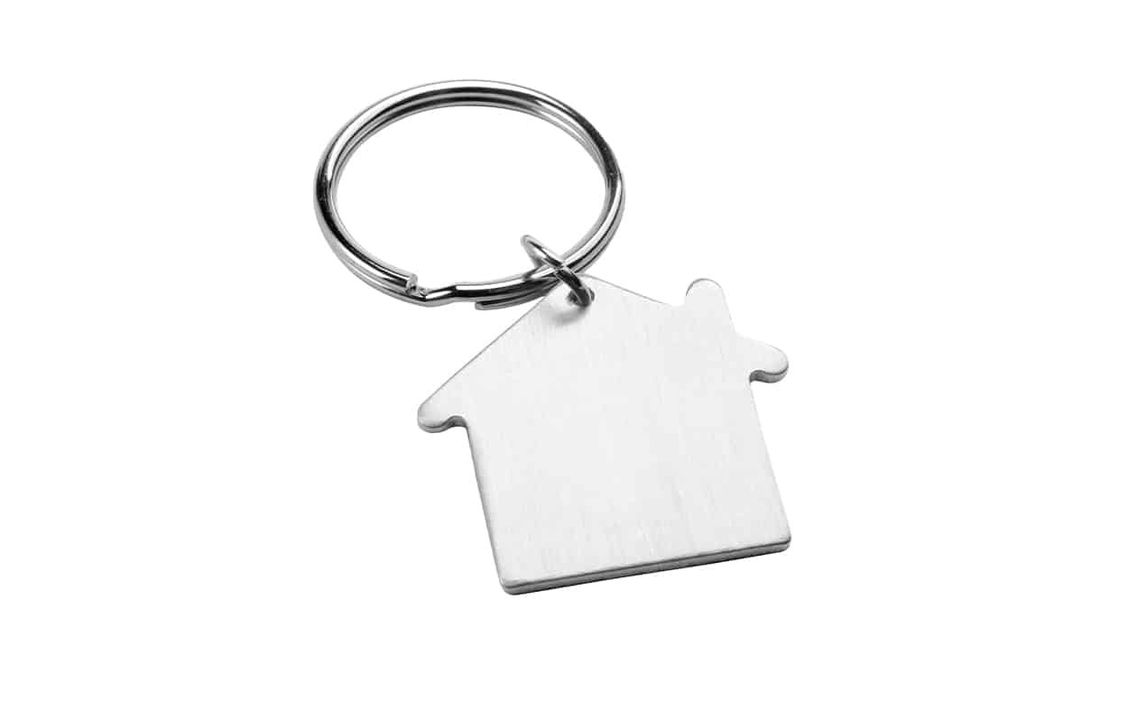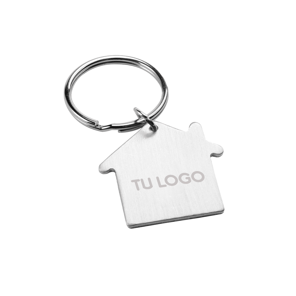 Llavero de aluminio con forma de casa. Cromado satinado.
